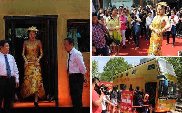 4月25日,一輛“黃金公交車”亮相山東濟南。據(jù)介紹,該公交車80%的部分都貼了金箔,“黃金美女”模特身上佩戴的黃金飾品價值兩百萬,公交車車內(nèi)掛滿了數(shù)千件黃金飾品,重達幾十公斤,總共價值500余萬。(來源:騰訊新聞 陳寧/CFP)