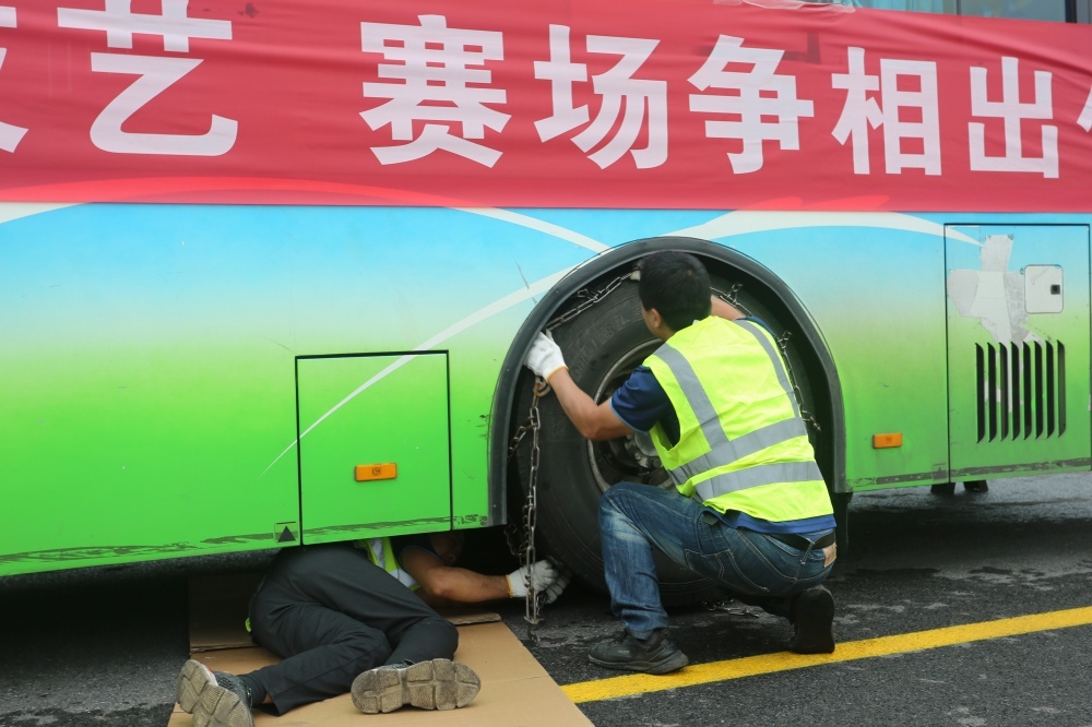 在安裝防滑鏈項(xiàng)目比武現(xiàn)場(chǎng),市公交集團(tuán)汽修公司員工王剛、劉小備兩人準(zhǔn)備充分、配合默契——先由一人進(jìn)入車底檢查車況,一人拿出防滑鏈等待安裝。很快,車況檢查結(jié)束,兩人迅速將防滑鏈套上輪胎,并將防滑鏈上的橡皮繩捆扎成規(guī)則五角形,經(jīng)檢查內(nèi)外側(cè)松度并無(wú)明顯松垮現(xiàn)象后,以3分09秒的成績(jī)結(jié)束比賽。