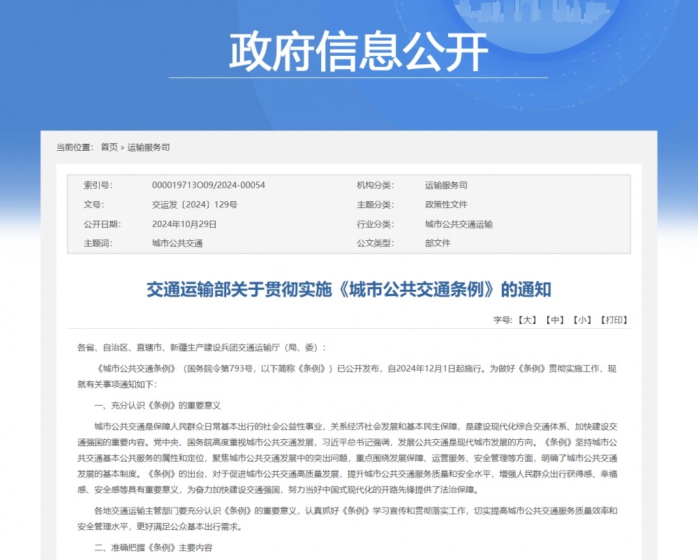 10月29日,交通運輸部網(wǎng)站發(fā)布《關(guān)于貫徹實施〈城市公共交通條例〉的通知》。通知提到,從充分認(rèn)識《條例》的重要意義、準(zhǔn)確把握《條例》主要內(nèi)容、有力保障《條例》落地實施來貫徹實施。