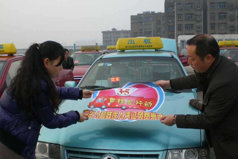 昨日7時(shí)30分,市出租汽車公司雷鋒車隊(duì)的20臺(tái)雷鋒車和20臺(tái)優(yōu)秀出租汽車匯集到泉口一路市出租汽車公司院內(nèi),統(tǒng)一粘貼心形的"3-5雷鋒在行動(dòng)""老年人和殘疾人免費(fèi)乘坐"活動(dòng)標(biāo)識(shí)(如圖),經(jīng)過(guò)簡(jiǎn)短的啟動(dòng)儀式后,駕駛員們整裝出發(fā),在城區(qū)運(yùn)行,對(duì)老年人、殘疾人和到醫(yī)院就醫(yī)但行動(dòng)不便的病人實(shí)行免費(fèi)接送服務(wù)。