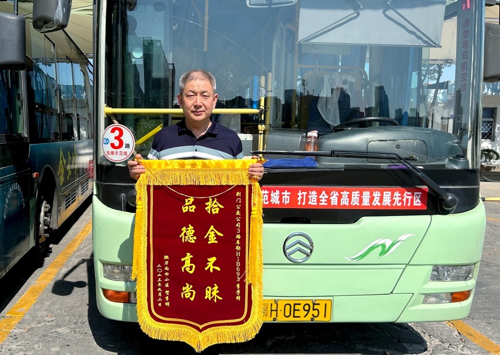 而另一邊,發(fā)現(xiàn)丟了錢包的賀先生在去往武漢的火車上著急萬分,抱著不確定的心態(tài)打電話到客服調(diào)度中心詢問,看能否找回,誰知火車才行至鐘祥站的時候,就接到了電話,說錢包已找到,賀先生頓時放下心來。待賀先生從武漢歸來后特地送來一面錦旗以表示感謝,為公交培養(yǎng)出李學(xué)鋒這樣拾金不昧的駕駛員師傅點贊。